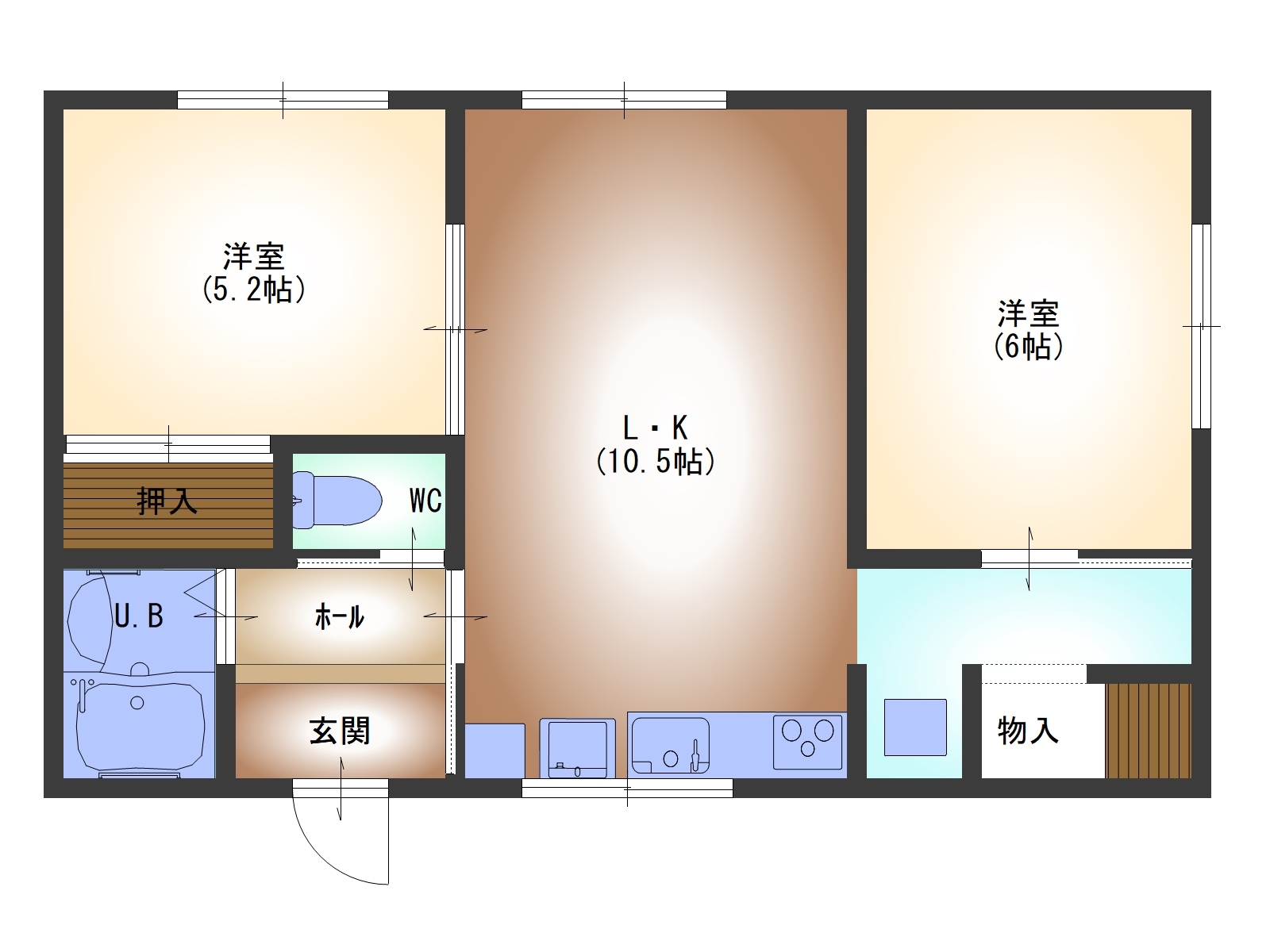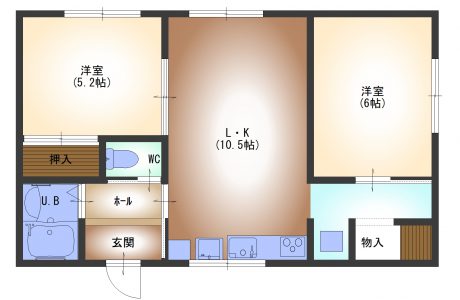 間取り内訳 | リビングキッチン10.5帖・洋室6帖・洋室5.2帖・フロトイレ別・ウォシュレット・洗面台・収納有 | |